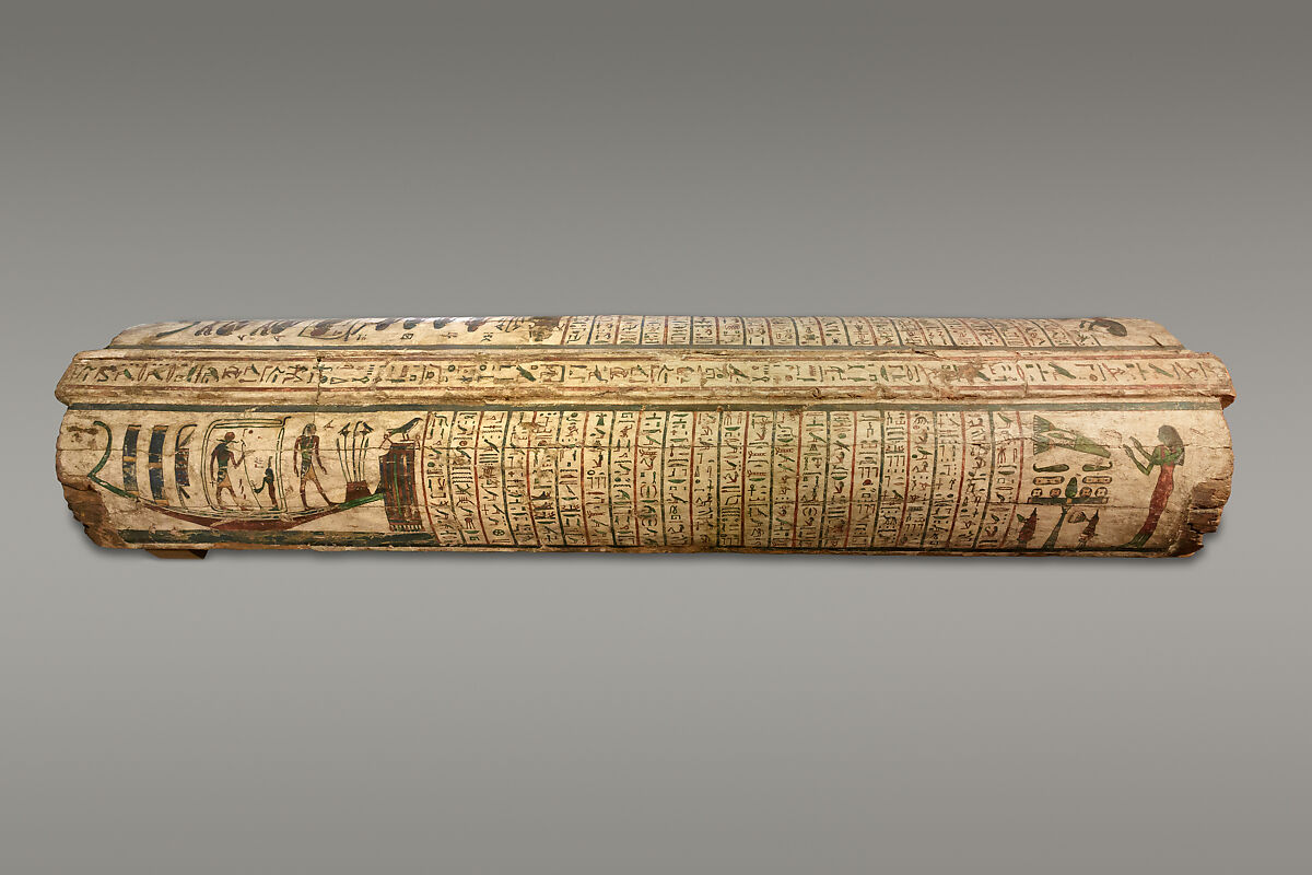 Together, these scenes evoke the four cardinal directions to create a cosmogram. On the interior is a figure of the sky goddess, Nut. The inscriptions are funerary spells meant to help Tawaher achieve eternal life as a blessed spirit.