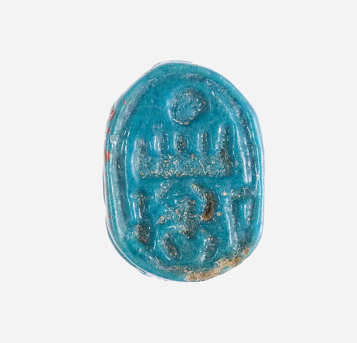 This scarab is inscribed on the base with the throne name of Thutmose III, Menkheperre. Another scarab with this king's name is part of a necklace found in a private house at Malqata. The necklace also has two amulets inscribed with the throne name of Amenhotep III, Nebmaatre.