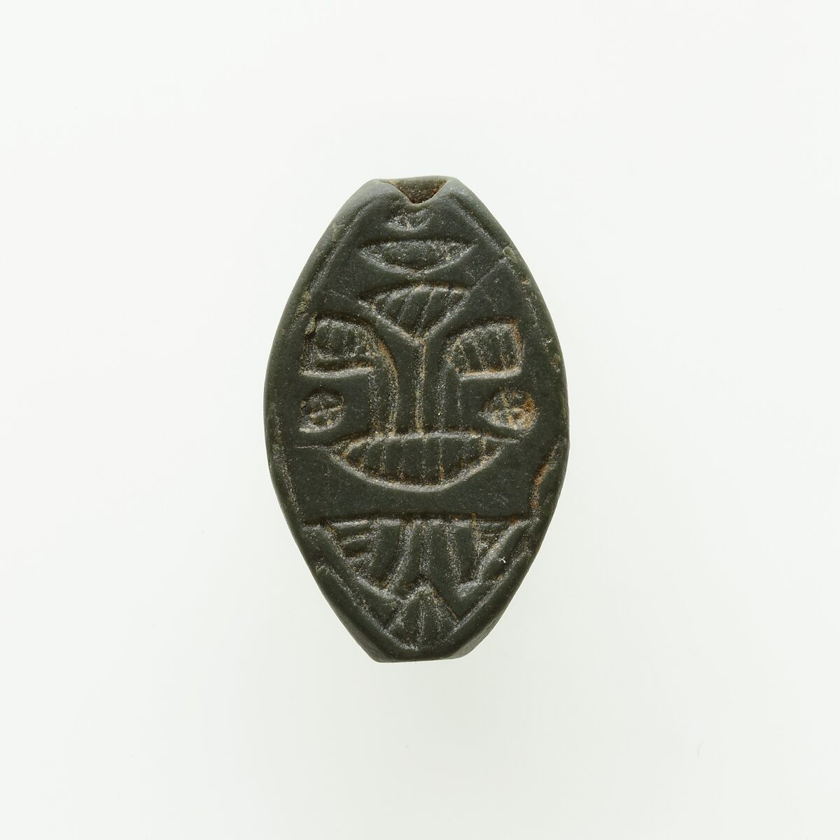This cowrie-shaped seal-amulet was found with twenty-three scarabs and seal-amulets in the coffin of a young woman who was buried in Hatnefer's tomb (see 36.3.1 and 36.3 26). The base is inscribed with decorative floral patterns.