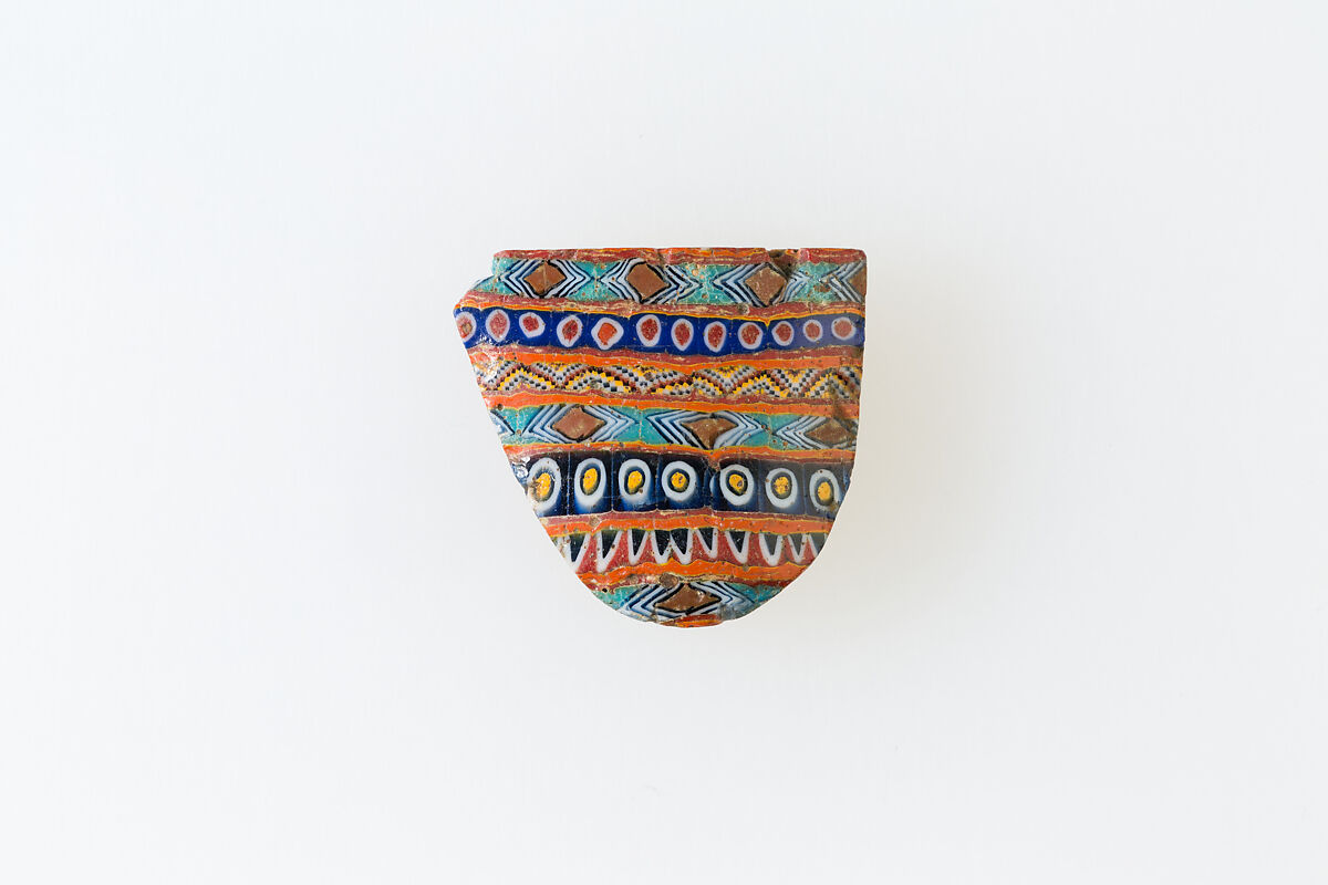 A mosaic glass technique allowed multiples of an image to be created: a figural or design composition was made by bundling colored glass canes, which were then drawn out into a long bar . The bar was then sectioned at right angles, probably by striking the bar with appropriate tools, to produce small inlay tiles. The tile would then be smoothed and polished on the face intended to appear outwards.
