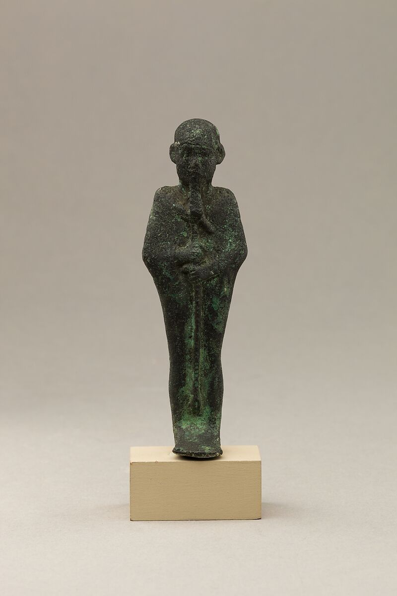 This statuette depicts Ptah, the chief god of Egypt's capital city Memphis and master craftsman of the gods. He is easy to identify by his tight-fitting cap, straight beard (different from the usual curved divine beard on other gods), and enveloping mummiform garment. The garment has a shallow stiff upper edge along the back of the neck, a feature that occurs with some regularity also on Osiris statuettes, but its meaning is unclear. Commonly Ptah holds a scepter that combines the symbols for life (ankh), dominion (was), and stability (djed), but here he holds only the was scepter, hearkening back to earlier representations of the god. Ptah was a benevolent and approachable god, characteristics that may have inspired his devotees to dedicate numerous representations of him in the Late and Ptolemaic Periods.
