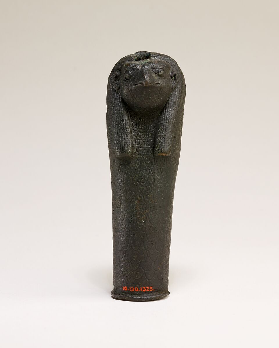 This hollow cylinder, surmounted by a falcon head, would have attached to the top of a pole or staff, to be used as cult equipment for rituals and during festival processions. The falcon deity wears the divine tripartite wig and a broad collar. A separately cast crown would have fitted into the large socket on top of the head, possibly a sun disc for the god Re Horakhte or a double crown for the god Horus.