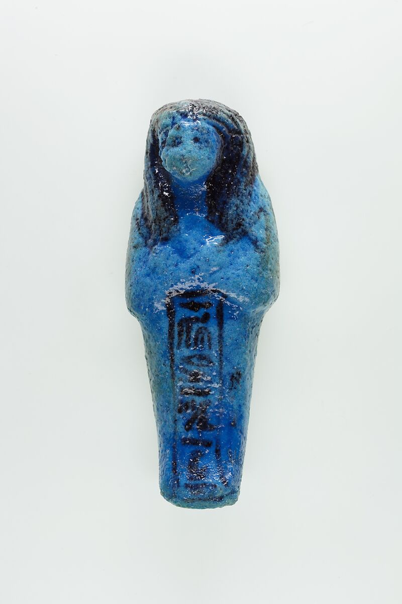 Almost 400 small funerary figures known as shabtis were found with Nauny’s burial. These can be seen as avatars, meant to carry out agricultural labor on Nauny’s behalf in the afterlife. Of the 393 shabtis discovered, 355 were workers like this one, and 37 were overseers (see for example <a href="https://www.metmuseum.org/art/collection/search/551114">30.3.28.3</a>). Based on other assemblages from this era, Nauny originally might have had a total of 365 workers, one for each day of the year. This mummiform figure holds a hoe in each hand and has a basket on its back. The inscription on the front of the body calls Nauny an “illuminated Osiris.” This indicated that she had been transformed through the process of mummification and identified with the principal god of the dead, then reanimated by the light of the sun god as he traveled through the Netherworld each night. Nauny’s shabtis were divided between seven boxes. Five of these, with their shabtis, were given to The Met, while two were sent to the Egyptian Museum in Cairo.