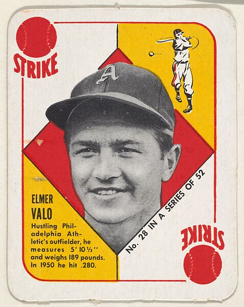 - Title: Card Number 28, Elmer Valo, Outfield, Philadelphia Athletics, from the Topps Red/ Blue Backs series (R414-5) issued by Topps Chewing Gum Company