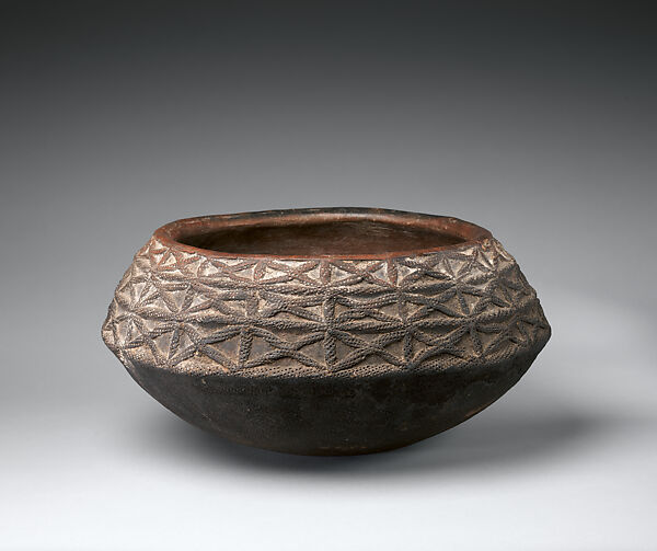 This mid-sized vessel was probably used either as a man's wash basin or a serving bowl. Possibly created in Babessi, on the Ndop Plain, a center of ceramic production extensively studied by anthropologist and curator Silvia Forni, such vessels might have originally held ritual significance. Today, their meaning has been broadened to take on a wider range of meaning as symbols of a greater social identity. The stylized spider motif represents a house-spider and is associated with notions of generosity.