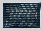 Although narrow-band fabrics can be tie-and-dye patterned before being assembled into cloth, this wrapper must have been assembled before the patterns were added. The bands were cut into equal lengths and stitched together along their weft selvages. Rather than being used to create a fringe, the warp ends were folded twice and stitched down. The white patterns were created by needle stitching and wrapping thick yarns around the warps of the thin white stripes. After this process was complete, the entire cloth was overdyed in an indigo bath. In placed where the fabric was stitched and wrapped tightly, the dye was unable to penetrate the white fibers. The resulting pattern, viewed horizontally as it would have been worn, consists of elongated zigzags composed of white dots and dashes across a ground of dark- and medium-blue striped cloth. The repetition and staggering of the pattern within this thoughtfully spaced composition creates an almost hypnotic oscillating effect, paralleling the rhythmic performances at which the wrapper might have been worn.