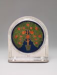 Rebecca Cauman’s striking and luminous silver and enamel bookends demonstrate her exceptional skills as a designer, metalsmith, and enamellist. Although Cauman was an active and influential member of Arts and Crafts communities in both Boston and New York, surprisingly few extant examples of her work are known. These bookends offer a distinctive response to British Arts and Crafts metal and enamelwork by such artists as Alexander Fisher and Robert Ashbee as well as the work of fellow Americans, particularly Boston, metalsmiths and enamelists, including Laurin Hovey Martin, Frank Marshall, and Elizabeth Copeland. Examples of this design featuring an enameled orange tree survive in copper; however, these bookends are the only known silver versions.
