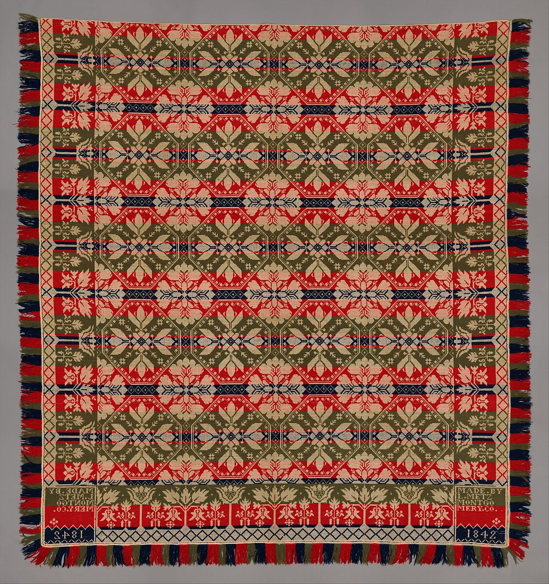 This coverlet was woven in a single wide panel on a handloom with a Jacquard attachment. Its central pattern is of alternating foliate medallions, and the border shows alternating tulips and bellflowers. Two corner blocks at the lower edge bear the woven inscription: MADE. BY/ L. METZ/ MONTGO/MERY. CO./1842. Leonard Metz was a third generation Mennonite weaver, who worked in the 1830s and 40s in Pennsylvania. In 1832 he advertised in a local newspaper that he had secured the patent rights for a way to weave "figured cloth such as coverlets, table linens, carpets, &c. in a manner superior to any heretofore manufactured in the U. States, having purchased the right for the district of the city and county of Philadelphia, and the counties of Bucks, Montgomery, Lehigh, Berks, Chester and Delaware… He is now enabled to weave almost any pattern which may be requested." (Norristown Herald, April 23, 1832). The advertisement goes on to further explain the breadth of his business and abilities. Strangely enough, although Metz held his new patent as of 1832, and had a wide territory in which he could claim exclusive rights for it, only a few other coverlets made by him are known today.