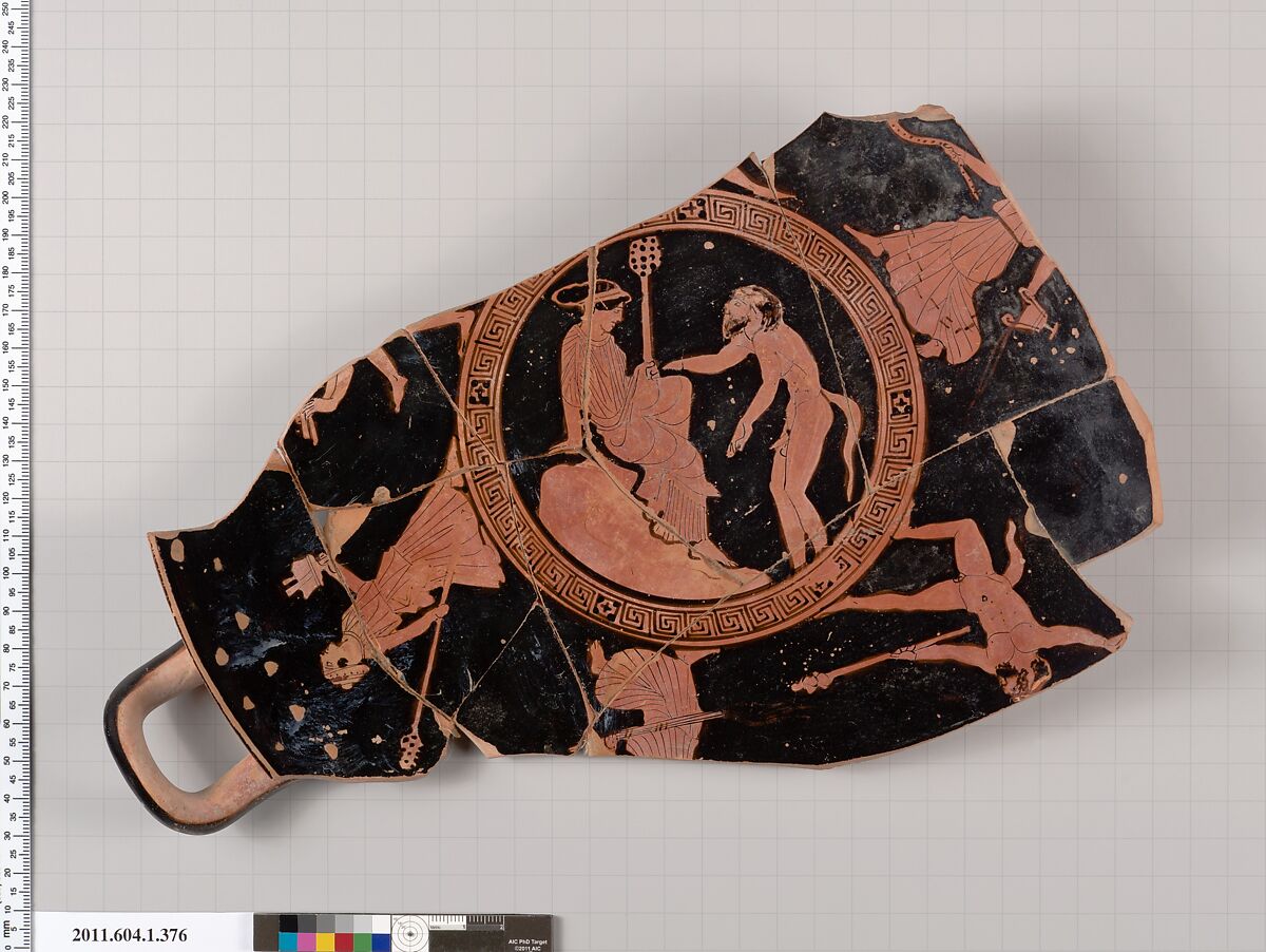 Tondo, maenad sitting on a rock, holding a thyrsos in her left hand, facing a satyr; figural band around tondo: maenad with sakkos and peplos, holding a thrysos in her right hand and a kantharos in her left; legs and arms of a satyr playing the aulos; lower leg and foot; maenad with peplos, holding a snake in her right hand and kantharos with fillet in her left, satyr with thrysos in left hand facing a maenad holding a torch in her left hand; Obverse, handle palmette, lower legs and body of a draped figure leaning on stick facing the lower legs and body of another draped figure; draped figure with stick facing another; Reverse, handle palmette, feet to right; lower drapery and feet of figure; part of a staff or stick?