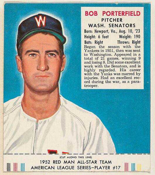 American League Series, Player # 17. Trade card from the "1952 Red Man All-Star Team" series (T232), issued in 1952 by Red Man Chewing Tobacco.