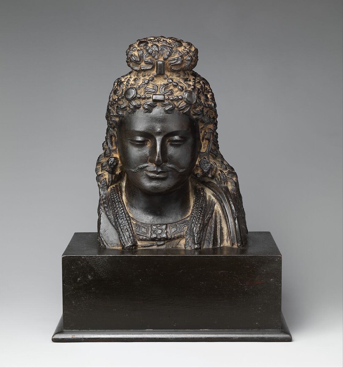 This handsome bust of a Bodhisattva, datable to the 2nd century AD, was produced as part of the architectural decoration of a major monastery in ancient Gandhara (present-day Peshawar district in northwestern Pakistan). The back of the piece is unfinished—originally it would have been attached to a niche or wall—a feature consistent with the vast majority of Gandharan figural sculptures; very few of which are fully in-the-round.