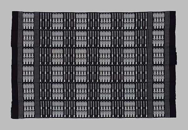 This Manjaka woman’s wrapper consists of six bands sewn together selvage to selvage to form a rectangular panel. Each strip, approximately eight inches wide, is made of black cotton and unspun white cotton, creating geometric abstract motifs of zigzags, chevrons, crosses and diamonds. The same pattern is repeated in vertical columns, which are aligned so that they match with those of adjacent strips.