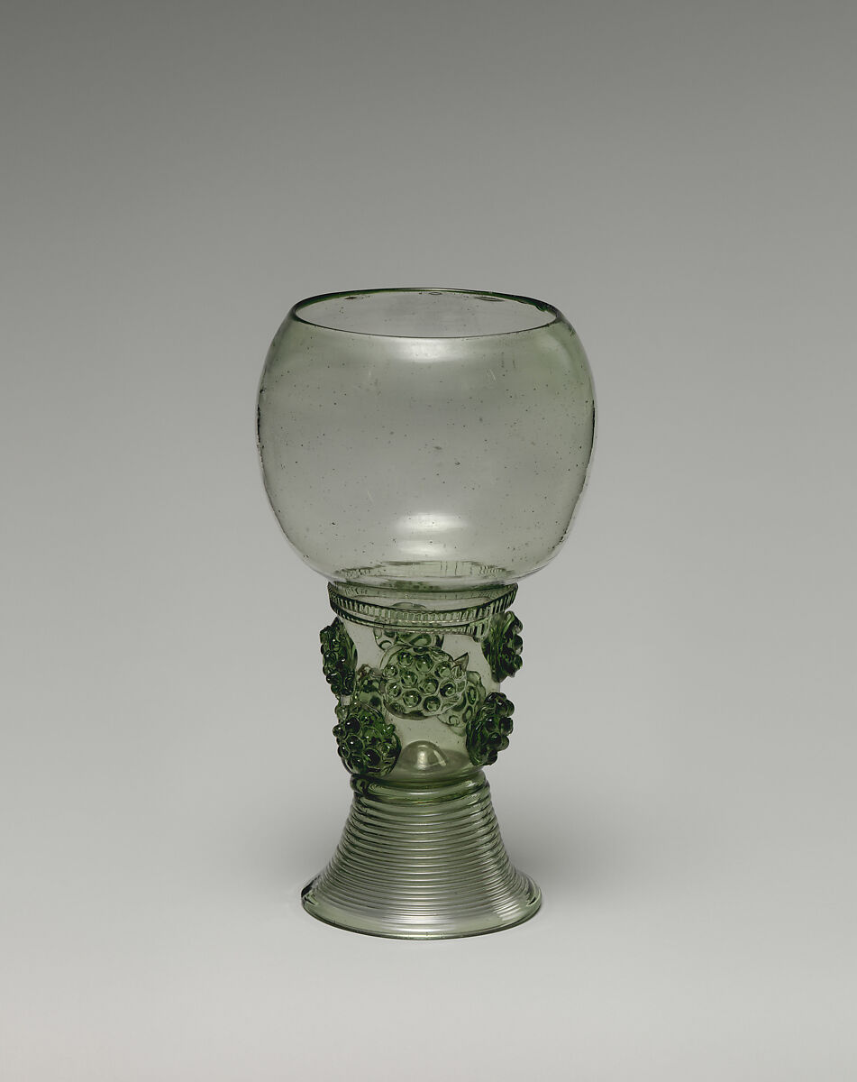 This roemer is a very appealing piece complements two outstanding examples of Dutch seventeenth-century roemers (04.24 and 27.185.236) of massive scale and top level craftsmanship. It is a comparative piece of more pedestrian manufacture and size more appropriate to daily use. Seen alongside a related goblet in the Museum's collection (27.185.213), this provides a complete gamut of scale graduations typical for this type of drinking vessel.