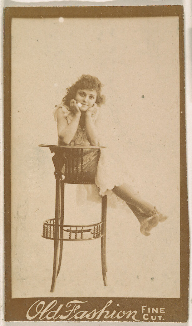 - Title: Actress posing on back of tall chair, from the Actresses series (N664) promoting Old Fashion Fine Cut Tobacco