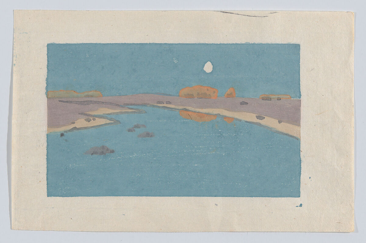 A leader of the American Arts and Crafts movement, Dow’s advanced ideas concerning color and design are beautifully conveyed by his woodcuts. Born in Ipswich, Massachusetts, the artist studied tonalist painting in France for five years then returned to Boston in 1889. Fascinated by Ukiyo-e prints, Dow examined examples at the Museum of Fine Arts, together with Japanese printing equipment at the Smithsonian Institution. After mastering a multi-block process, he created forty compositions between 1891 and 1921, many printed in multiple variations with experimental inking. These works explore the expressive potential of color and, in 2016, the Museum acquired a significant group, including Marsh Creek. Exemplifying Dow's mature technique, no key-block was used in this print, and the landscape is formed from adjacent color zones. Printing the layers required great skill, and overlapping forms have been used to great effect. Thinly applied golden ink veils underlying blues and purples, with ripples scored into the wet ink -- a technique more common to watercolor than woodblock printing. Other variants of this subject use dark tones to suggest a moonlit scene, but the present example evokes bright twilight.