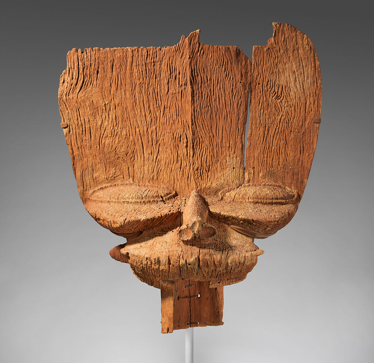 This majestic creation is at once massive and ethereal. A two-dimensional forehead soars above compressed volumetric features. The penetrating, boldly outlined eyes gaze heavenward. The geometric motifs that were densely inscribed across the upper part have been heavily eroded and only deep grooves are evident now. This work may have been a prototype for the extant tsesah corpus due to its age, scale, and fluid design. The extensive native repairs testify to its long life as an avatar of Bamileke royal power. Once it became too fragile to be used, a replacement example was carved and the decommissioned crest remained stored within its community.