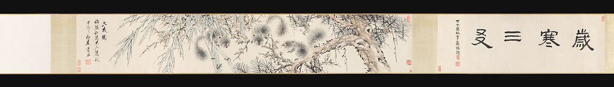 Three squirrels frolic among densely intertwined branches of pine, flowering plum, and bamboo. Together, pine, bamboo, and plum are known as the “Three Friends of Winter,” symbolizing noble character for their ability to thrive in harsh conditions. A squirrel perches on each plant, presenting echoing counterparts. The artist, Xugu, used dry brushstrokes over light washes to articulate the standing bristles of the squirrels’ fur. Their defined eyelashes, bulging eyes, and narrow pupils convey alertness in a bustling environment. Sojourning in the highly commercialized city of Shanghai, Xugu perhaps intended to evoke the intensified pace of late nineteenth-century urban life while also affirming friendship with an insider circle.