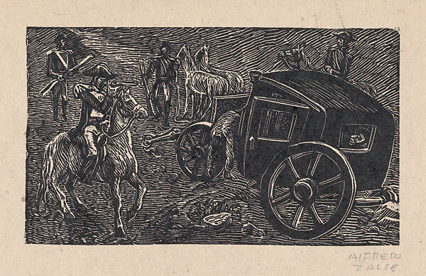 - Title: Soldiers ambushing a carriage and attacking people, illustration for 'Hidalgo'