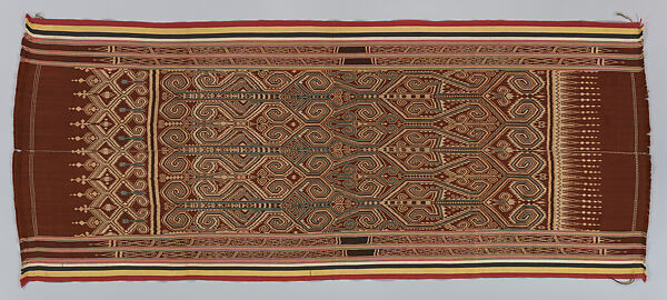 Ceremonial cloth (pua) decorated with potent and charged iconography are among the most precious textiles of the Iban (‘Sea Dayak’) tribes of northwest Borneo. Textiles decorated in this manner were used almost exclusively to wrap head trophies or skulls and to mark off sacred spaces and decorate altars on which these were placed as offerings and intermediaries for divine intervention. They could also be used to wrap or cover the deceased in funerary proceedings. Iban women are initiated into the art of dyeing and weaving the intricate ikat motifs by certain spirits. They begin as young girls, copying patterns and over time as they become more accomplished, create ritually powerful new designs.