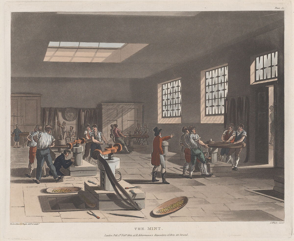 In the late thirteenth century the Royal Mint moved into the Tower of London and produced, from there, most of Britain's coinage. Pugin and Rowlandson here show workers feeding metal blanks into presses that hold dies able to stamp beyween sixty and eighty coins a minute. In 1810, shortly after this print was made, a new Mint, equiped with steam-powered machinery, opened on Little Tower Hill just outside the fortress's walls.