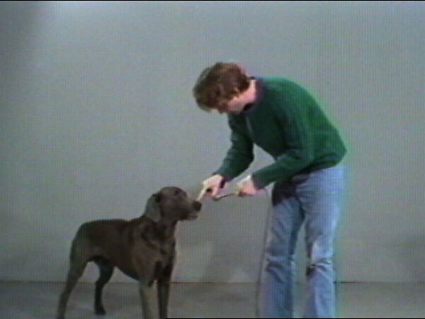 This short is part of a collection representing the entirety of Wegman's work in video to date (excepting commissioned works such as his celebrated pieces for Sesame Street). Wegman took up video while studying painting at the University of Wisconsin. Using the camera like a sketchbook, always with the monitor on so he was watching what he was recording in real time, Wegman improvised situations that both slyly took apart the conventions of painting and sculpture that his generation was leaving behind, while also puncturing the pretensions of Conceptual Art as it was being codified and institutionalized on the East Coast.