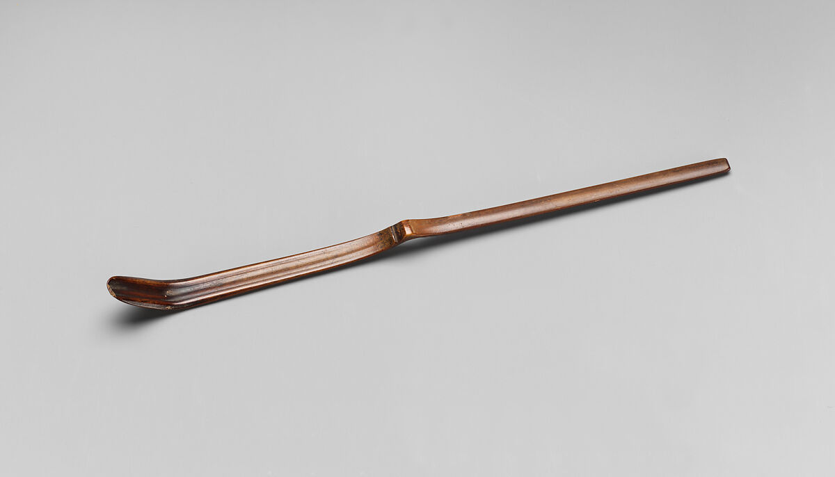 Sen no Rikyū was one of the most influential figures in the development of the tea ceremony, or chanoyu. He served as tea master to two of the most powerful warlords of the sixteenth century. His emphasis on modest, rustic simplicity for the utensils as well as the surroundings resulted in a new, simpler style of tea ceremony known as wabi-cha that became standard beginning in the Momoyama period (1573–1615). Rikyū developed and created many Japanese-style tea-ceremony objects, including tea scoops and flower containers, and he also produced designs for teabowls. He cut bamboo for the utensils himself; this tea scoop was carved from a single narrow piece of bamboo. The raised, rounded end was used to transfer powdered green tea from the tea caddy to the teabowl.