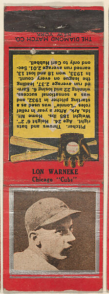 - Title: Lon Warneke, Chicago Cubs, from the Baseball Players Match Cover design series (U1) issued by Diamond Match Company