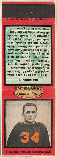 Jim Mooney, Cincinnati Reds, from the Football Players Match Cover design series (U6) issued by Diamond Match Company