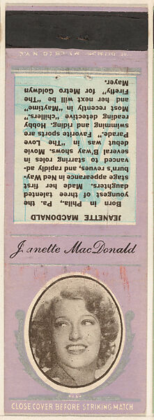- Title: Jeanette MacDonald from Movie Stars Match Cover design series (U21) issued by Diamond Match Company