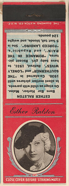 - Title: Esther Ralston from Movie Stars Match Cover design series (U21) issued by Diamond Match Company