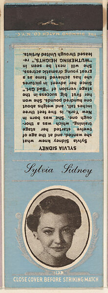 - Title: Sylvia Sidney from Movie Stars Match Cover design series (U21) issued by Diamond Match Company