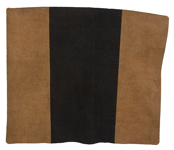 Barkcloth fabrics were worn as wrappers by men, women, and children. Composed of three panels finely sewn together with raffia, this example spreads open into the subtle shape of a fan. A central dark panel is flanked by two lighter lateral panels. This example’s small scale suggests that it was either made to be worn by a child or as a display piece. If worn, the fabric would have been gathered around the body, passed between the legs and secured at the waist with a belt, creating a form of puffy trousers.