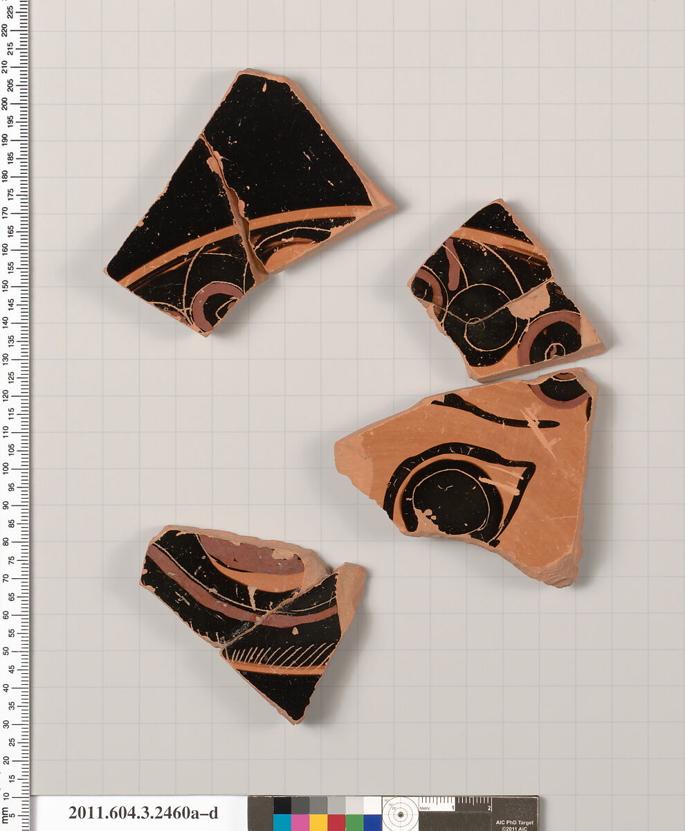 Interior, one fragment has part of one eye, and eyebrow, and a bit of the hair of a gorgoneion; two fragments have parts of the hair of a gorgoneion; a fourth fragment has part of the tongue, lower lip, and beard of a gorgoneion; Exterior, one fragment has part of a palmette-lotus frieze; the three other fragments have black glaze