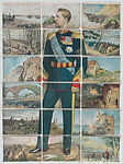 This set of puzzle cards details the history of Romania leading up to the War, touching on geography, industry, and society. On either side of the central figure, King Ferdinand I, are scenes of Romania's military campaigns throughout World War I.