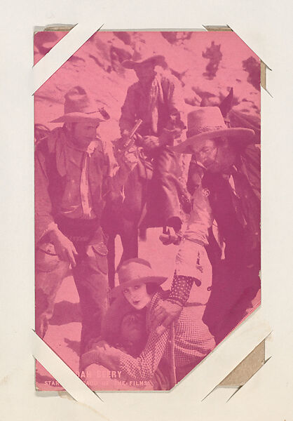 From Western Stars or Scenes Exhibit Cards series (W412). Distributed by Exhibit Supply Company of Chicago. Postcard-sized thick card. Dispensed in arcade machines. Pink toned.