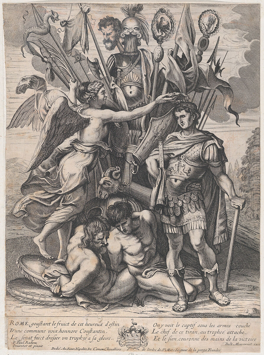 - Title: The Trophy of Constantine, with Victory at left crowning the emperor with a laurel, behind them a bounty of arms, armor, prisoners, and Maxentius' head on a stick
