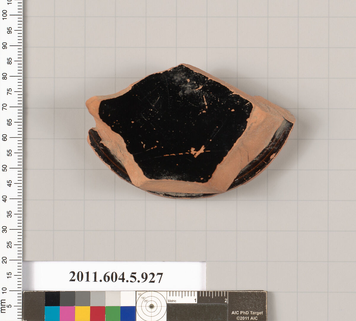 - Title: Terracotta fragment of a stemless kylix (drinking cup)