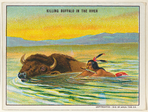 - Title: Killing Buffalo in the River, from the "Indian Life in the 60's" series (T73), issued with Hassan Cork Tip Cigarettes by the American Tobacco Company