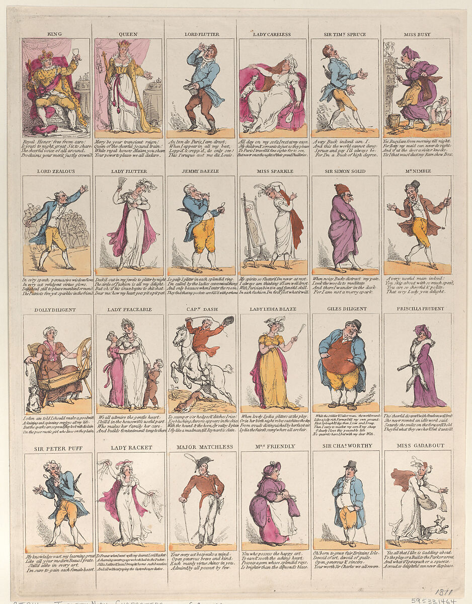 Twenty-four small figures on this sheet embody the roles of King, Queen, Lord Flutter, Lady Careless, Sir Timothy Spruce, Miss Busy, Lord Zealous, Lady Flutter, Jemmy Dazzle, Miss Sparkle, Sir Simon Solid, Mr. Nimble, Dolly Diligent, Lady Peaceable, Captain Dash, Lady Lydia Blaze, Giles Diligent, Priscilla Prudent, Sir Peter Puff, Lady Racket; Major Matchless, Mrs. Friendly, Sir Charles Worthy, Miss Gadabout.