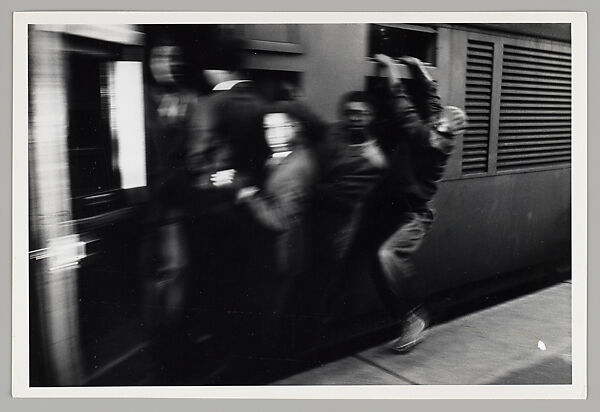 One of South Africa’s first black photojournalists, Ernest Cole set out to comprehensively document contemporary life in the country from a specifically black perspective, exposing the corrosive effects of daily political injustices under the white supremacist regime. His photographs of the segregated railway stations and trains depict the dehumanizing conditions black African workers endured on their daily commutes. Having been forced to relocate to towns far from their jobs, they were subjected to such extreme overcrowding that they were forced to stand packed together for hours at a time; others were forced to ride clinging to the exterior of the train. In his 1967 book, House of Bondage, in which this photograph was published, Cole wrote of the dangerous practice of hanging on to precarious perches on the outside of trains, which was called "washing": "For when a train goes by at speed these passengers look like clothes hanging on a washline. It is no exxageration to say that this wash hangs on for dear life. In one recent year, about one hundred and fifty Africans were killed riding on the Johannesburg trains alone."