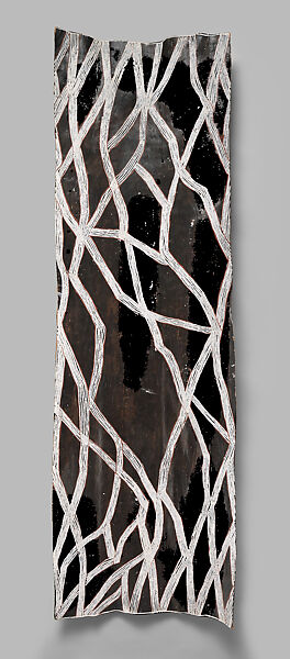 Hewn from large rectangular strips of stringy bark from the eucalyptus tree, the uneven surfaces of these four bark paintings are each primed with a single wash of color which enhances the natural contours of its undulating form. The natural earth pigments (white and light pink clay, russet brown ochre and black charcoal) are mixed with PVA glue as a binder creating a paint of thick, fairly unctuous consistency. Using a fine human hair brush, the artist works methodically and systematically, laying down fluid trails of parallel lines that flicker across the length of the painting creating a dynamic frame at the outer edges and leaving an open space of contrasting color at the center. Black, russet brown and pale pink—the empty ground of three of the four paintings creates a backdrop for the dynamism of the lightning strikes evoked at the edges of each work. These three works can be seen as preliminary stages in the artists’ exploration of this particular phenomenon - the flicker of lightning across the sky; the dramatic spray of salt water as it connects with the underwater rock on the coast at the sacred site of Baraltja. Madayin miny’tji are the unique geometric designs owned by Yolngu clans and used in ceremonial contexts. Only in the fourth and final work, does the artist unite these disparate networks of lines as a means to draw together the opposite ends of the painting and its borders—to establish and resolve the energy of miny’tji, the dynamic clan designs perceived by Yolngu that proliferate in, and actively punctuate the landscape.