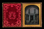 This work of art is currently on loan to the museum.With crisp precision, this daguerreotype delineates the clapboard siding, slatted shutters, and gridded window patterns on the exterior of a Connecticut general store. Proprietors Henry Dawson and Benjah Douglass sold their own confections and cigars, as well as goods they imported from the West Indies on a few trading ships. Their canned and bottled wares are just visible through the glass. In addition to the storefront’s bold signage, the shop initials, scrawled on a barrel before the entrance, act as an accidental logo.