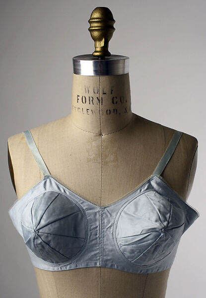 The gored cups of this late 1940s brassiere created an aggressive pair of breasts set high on the chest, an ideal shape to give form to a tight-fitting sweater. The 1950s saw an almost comical elaboration of the technology of the brassiere, including intricate topstitching, underwires, various paddings and inserts, and multiple methods of suspension that could raise, separate, or push together the breast as desired. The 1950s also marked the first widespread use of breast implants in the form of the since banned ivalon sponge.