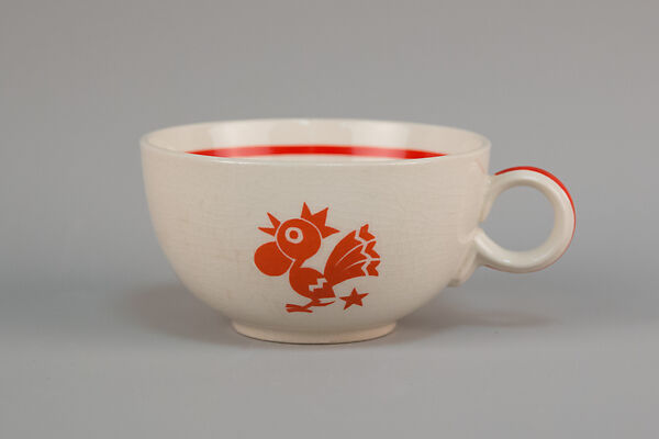 Viktor Schreckengost was a most prolific and influential industrial designer, who enjoyed a long career during the 20th century. He was literally born into the ceramics industry, in Sebring, Ohio, where his father worked at a ceramics factory. Schreckengost studied at the highly influential Cleveland School (now the Cleveland Institute of Art), graduating in 1929, and launching into a successful career, both designing and teaching. By the mid-1930s Schreckengost had already established his fame as a ceramic sculptor. He also worked as a designer in the tableware industry, and by that time had begun designing it in a modernist mode, providing designs for both the forms and the decoration. One of his most successful, was his “Manhattan” shape, with its rounded, ample, simple, and spare forms, with unornamented rims. Its very name, “Manhattan,” implies modern, urban life. The shape was conceived as a vehicle for transfer-printed decoration, allowing for new designs to be issued annually. In about 1935 the American Limoges China Company (later Sebring Pottery), where he serve as artistic director, introduced his Animal Kingdom line on “Manhattan” forms. It features various simplified animal motifs—humorous stylized designs of elephants, donkeys, pigs, squirrels, and fish, each accompanied by a carefully placed star. The designs were not hand-decorated, but rather were applied with decals. In many ways the chubby and cheerful silhouettes in vibrant colors are almost childishly naïve.