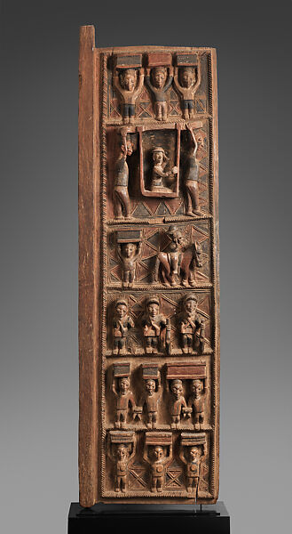 This work of art is currently on loan to the museum.Yoruba sovereigns in southwestern Nigeria commissioned regional masters to adorn their palaces with lavish sculptural programs. Among the most celebrated and highly sought out of these individuals to gain acclaim for the depth and dynamism of his distinctive carving style during the late nineteenth century was Olowe of Ise. Olowe filled the surface of this architectural element with six superimposed horizontal registers of frontally facing retainers that surround a European carried in a litter rendered in profile. The right side of this portal, now in the collection of the Smithsonian Institution’s National Museum of African Art, features the Yoruba sovereign who was its patron. Together these two elements of a single palace door commemorate the Arinjale of Ise’s welcoming of Captain Ambrose's British delegation to his court at the beginning of the twentieth century.