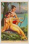 Rama and Sita are depicted seated on a riverbank. Sita, her sari draped suggestively across her body, points into the distance; Rama directs his gaze in that direction. In one hand, Rama holds a bow, and the other, he places on Sita’s shoulder. A set of arrows can be seen lying on the ground. The figures are depicted in accordance with the realistic conventions of representing Hindu deities first developed by the Ravi Varma Press, with naturalistic modeling and shading. This print was produced by Chimanlal Chhotalal & Co., a printing company founded in 1933.