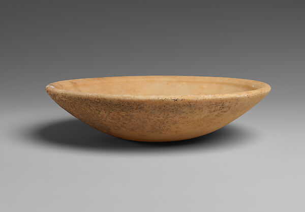 The vessel’s walls rise from a flat base and gently curve out to form a shallow bowl with a thickened, rolled rim that would have prevented liquids from spilling.