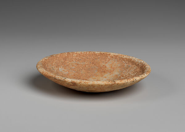 This rolled-rim shallow bowl is completely intact. A reddish-brown encrustation covers the bowl, though less so on the interior due to cleaning. There are calcium carbonate deposits mainly on the exterior. This is a particularly well-preserved example of a shallow bowl with swollen, rounded rim designed to keep liquids from splashing over the sides.(1)