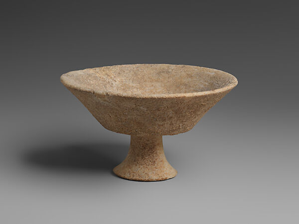 A characteristic example of its type, both in size and form, this cup has a rounded bowl-like interior, and the pedestal is slightly hollowed underneath. The profile of the vessel has slightly flaring sides and the pedestal foot flares out to a beveled edge.