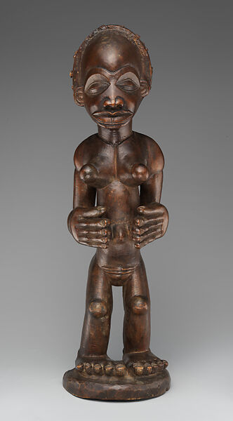 By the 19th century, Chokwe chiefs, called mwanangana, or “lords of the land,” had established trade routes to the Atlantic Coast and alliances with the Portuguese. Profiting from commerce in ivory, rubber, wax, and the trade of enslaved people, they emerged as important regional rulers whose prestige and power was reflected in their courtly arts. As chiefs bore a sacred duty to the prosperity of their subjects, objects associated with rituals of enthronement were produced to reinforce the mythical origins of their dynasties. Many figures carved in commemoration of chiefs depict those rulers wearing the distinctive, voluminous headdress of the Chokwe founding hero, a Luba price named Cibinda Ilunga. This portrait most likely represents and commemorates a chief’s leading wife, namata, or a queen mother mwanangana wa pwo. Due to the matrilineal nature of succession in Chokwe society, both positions held great ceremonial significance. Unlike mwanangana figures, including the Met's seated chief with finger piano, which are relatively abundant, female figures of this type are quite rare. As in most commemorative chief figures, the flexed arms and legs, set shoulder blades, and arched lower back of this female counterpart suggest a vitality and strength befitting a royal ancestor.